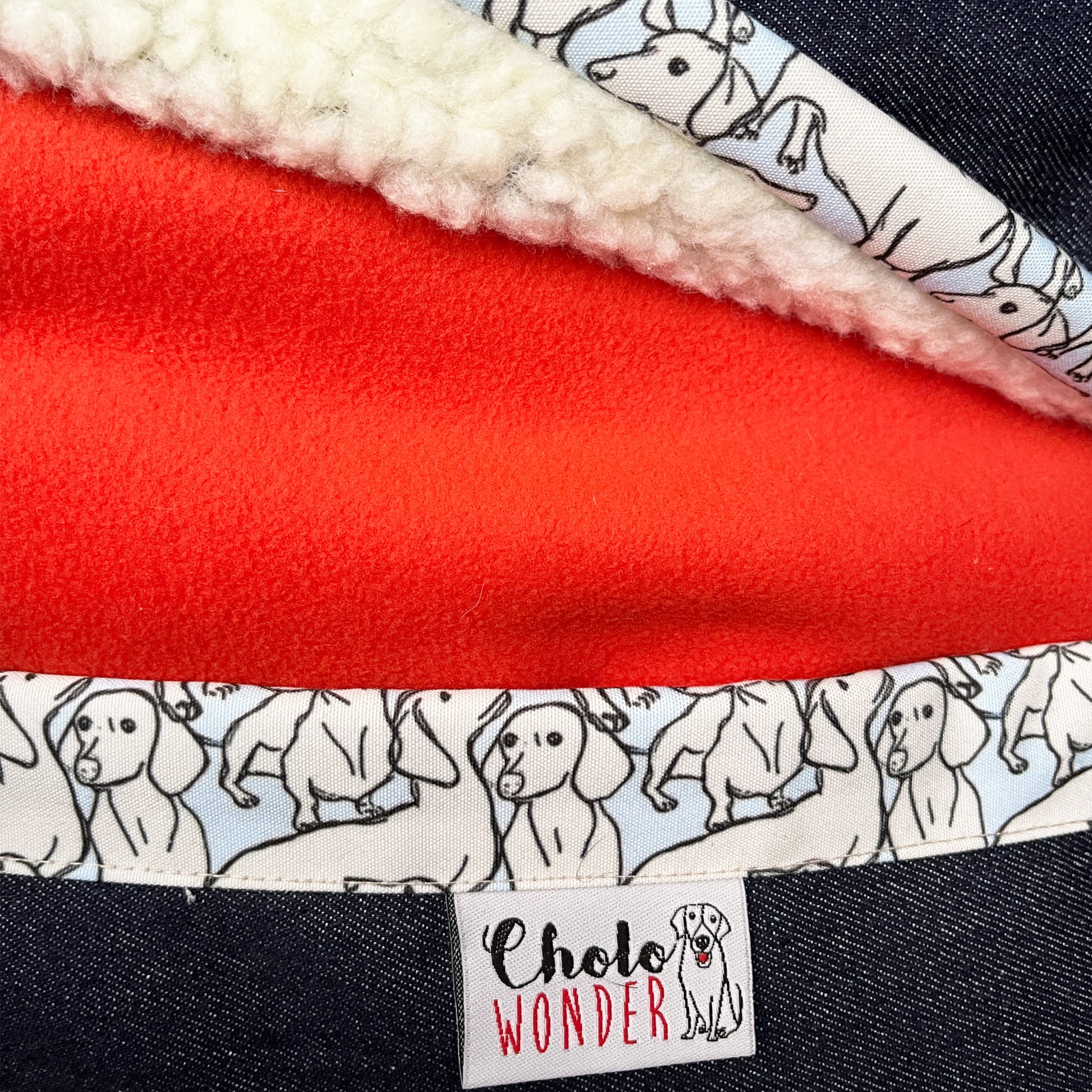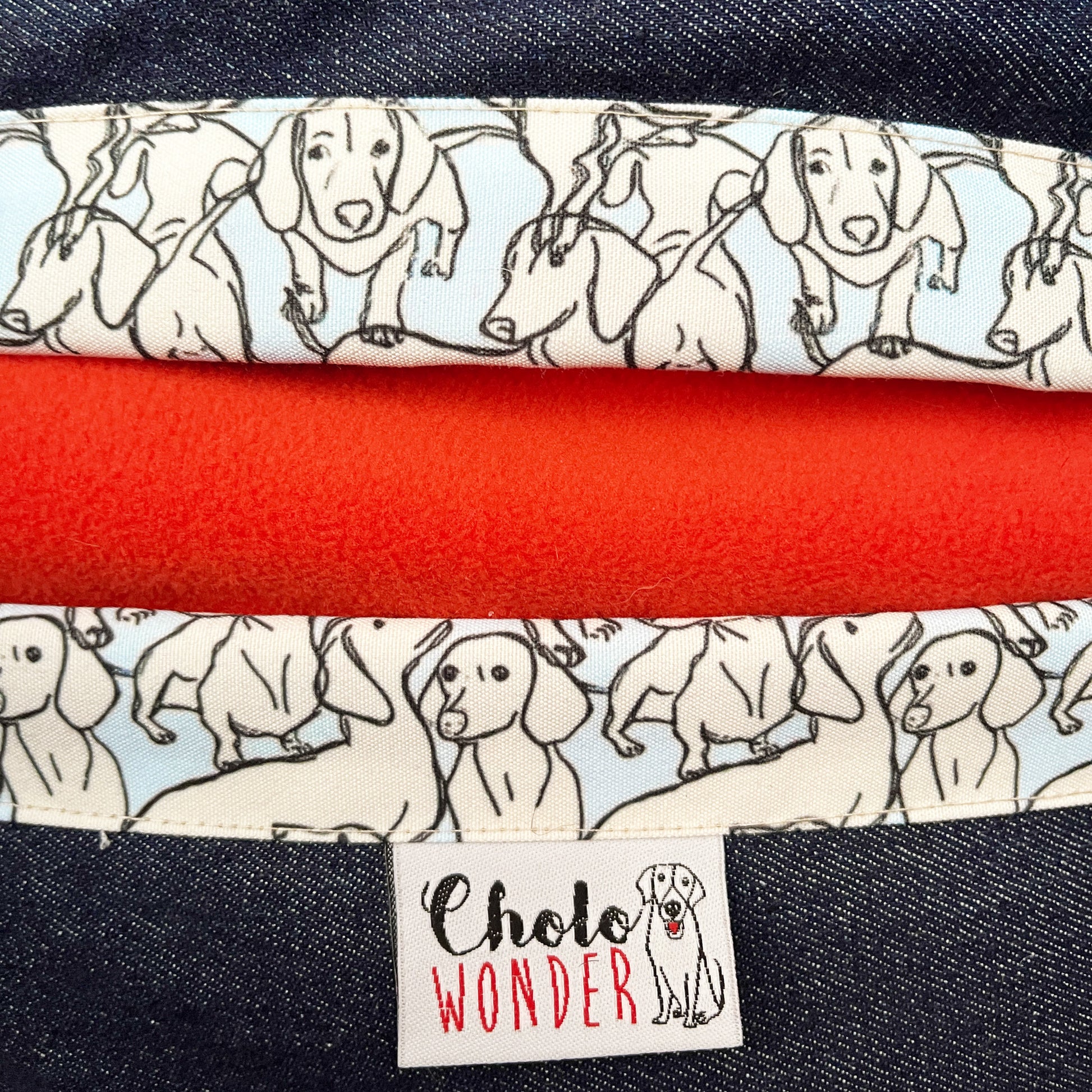 Saco de dormir térmico y desmontable con ilustración en bordes de perrito salchicha. Ideal para perros pequeños de hasta 10 kg, que buscan la sensación de madriguera. Lavable, fácil de mantener, duradero. Para ser usado al interior de la casa o sobre tu cama. Tus mascotas pueden meterse dentro o dormir sobre él. Se puede utilizar el saco de dormir y el cojín interior de manera independiente.