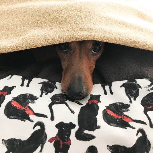 Saco de dormir denim azul ilustración perro salchicha 74X70 cms